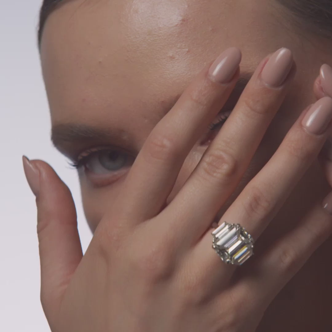 This one-of-a-kind jewel was created in collaboration with painter Angie Crabtree. Triptych is a form of art that has three painted surfaces hinged or displayed together, used by artists from ancient to modern. The timelessness in this art form is what inspired Angie to create this magnificent ring with two trapezoid cut diamonds, accompanied by an emerald cut diamond as the centerpiece.